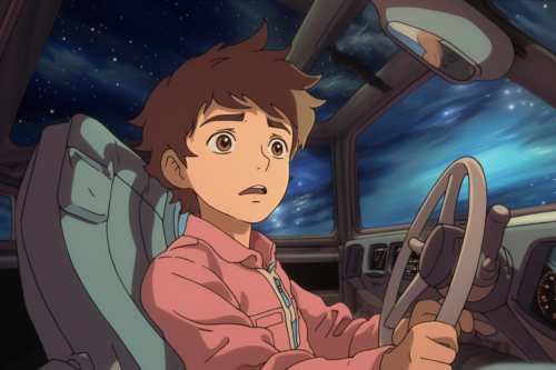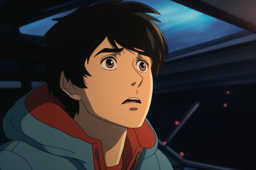 DVD screengrab, 2010 Studio Ghibli anime movie, young adult male driving a tiny spaceship wearing a blue shirt with light pink sweater. psychedellic background. character looking forward with left eye slightly higher than right eye --ar 3:2 --v 5.2