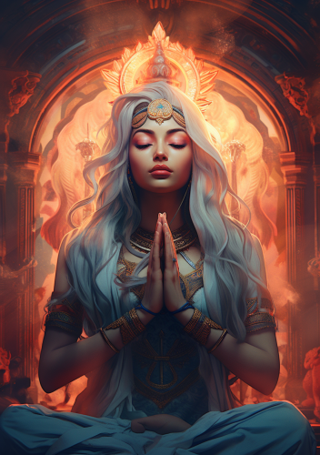 Beautiful woman goddess India praying in a temple and closed eyes, India type overlay, the style of psychedelic portraits, grindcore, hyper - detailed illustrations, giorgio vasari, caricature faces, joyful chaos, yup'ik art, Epic Composition, Heavenly, 8k, Pastel Colors, Concept Art --ar 7:10
