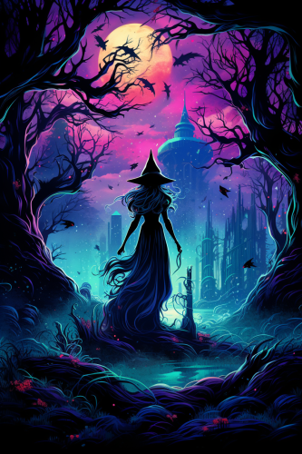a beautiful witch wall art painting, witchy, in the style of gothic dan mumford, richard doyle, robert crowley, henri le fauconnier, in the style of detailed vibrant illustrations, uhd image, whimsical illustrations, glowing lights, enchanting, cyan, 8k resolution,atmospheric, luminescent color scheme, in the style of psychedelic artwork, gorgeous colors, romanticized nature, threaded tapestries, i can't believe how beautiful this is, in the style of psychedelic, vibrant tapestries, contrasting lights and darks, dark cyan and purple --ar 2:3