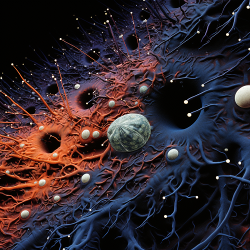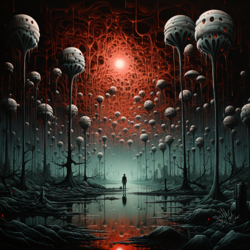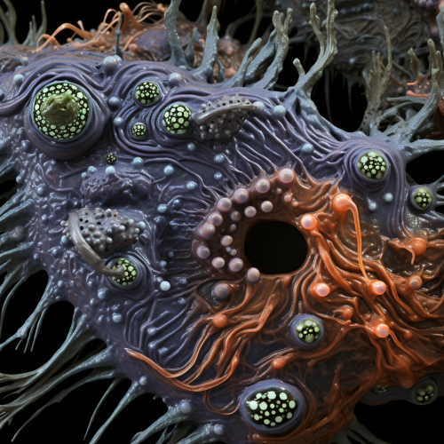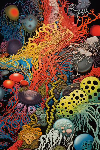 Dark and Gloomy Electron Colors microscope view by Frederic Remington, Salvador Dali, Stanley Kubrick and David Lynch. Microorganism forest, Kraken, Critters, Bacteria, Millipede, Hydnellum peckii. Reaction diffusion patterns, Larvae, tentacles, axons, microscopic organism, cell structure, plasma membrane, nerve fibers, ferrofluid patterns, fungi, macrophage, microscopic landscape, colorized line drawing, organ of corti, connective tissue, nerve cells, circuit board, glomerulus, vertebrae, podocytes. Mitochondria. Precious stones. Tropical flowers. Psychedelics Atoms. Organic. Neurons. Cytoplasm. Organelles in Flowers. Moss. Excalibur. Golgi Apparatus. Meditation. . Fantasia. Psychedelics Lianas. Lime. Molecules. Calm and serenity. Jesus Hidden. Incense fumes. Fantasia Style. Sarcophyton. Anthurus archeri. Corallium rubrum. Antipatharia. Acropora. Caryophyllidae Euphyllia. Epic Masterpiece and carved details. Quality. Huge scenery, insanely detailed and intricate details. 1988. Cowboy Bebop. japanese aesthetics, ray tracing light, ray tracing lines, ray tracing textures, photographed by Jan Saudek for i - D Magazine Ultra realist depth of field. Hypermaximalist illustration. 4600dpi