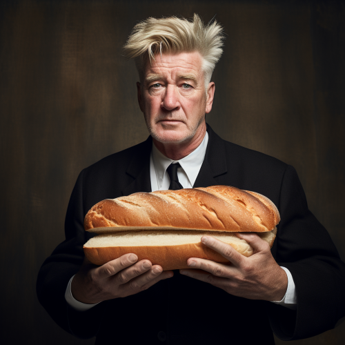 Imagine David Lynch with a white bread sandwich in his hairdo. --style raw