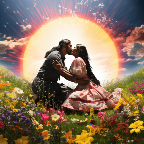 an eclipse shining over a couple in a bed of flowers. The couple is Indian leg wrestling. Rainbows drip from the sky as lasers come out of the couples fingertips.