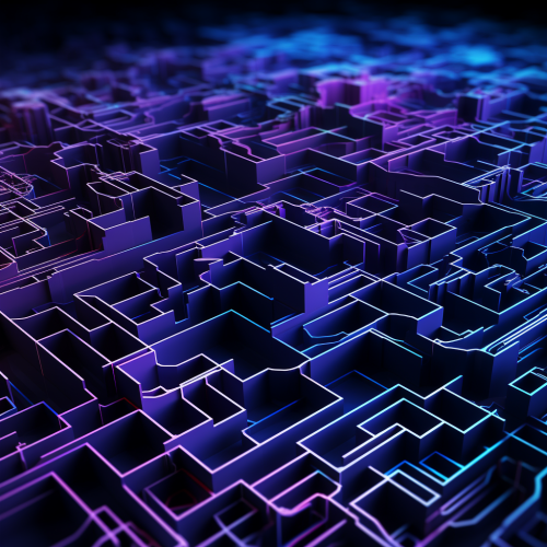 blue and purple neon lines intersecting over a landscape, merging into eachother like puzzle peices in an electric city grid. on black background, neon lines, gradients, flat, simple, geometric, abstract, dark, mc escher, psychedelic, perspective, minimal, serene, mysterious.
