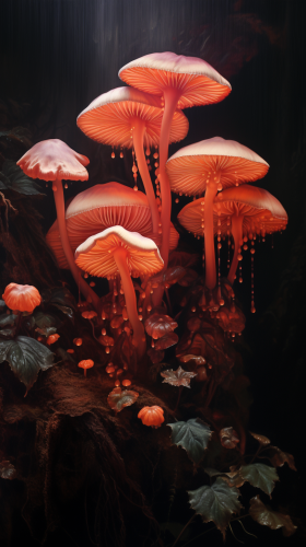 fantastic realm, dark atmosphere, pinky orange mushrooms, hyper realistic --ar 9:16