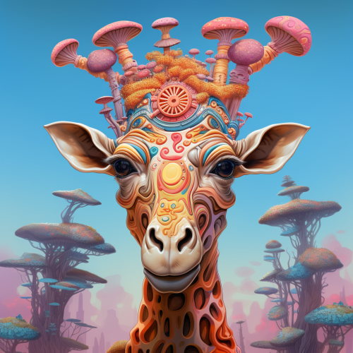 giraffe head with mushrooms growing out of his head, photo realistic, psychedelic, colorful --v 5.2