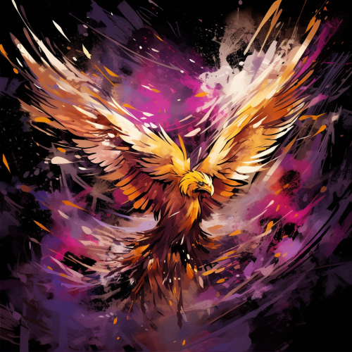abstract image of a small gold phoenix born from the explosion of a star in a cubic world full of brush strokes in pink, dark purple and beige, smudges in gold, geometric and chaotic splashes, in beautiful retro anime style odeo 808 aesthetic punk, manara style