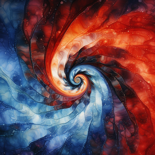 ice dyed spiral, indigo, orange, red, white, fractalism, triangles, serrealism, psycadelic