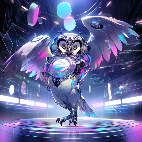 various character poses, closed wings, cyborg cyberpunk machine owl, disco ball stomach, POV --niji 5 --seed 3930226115