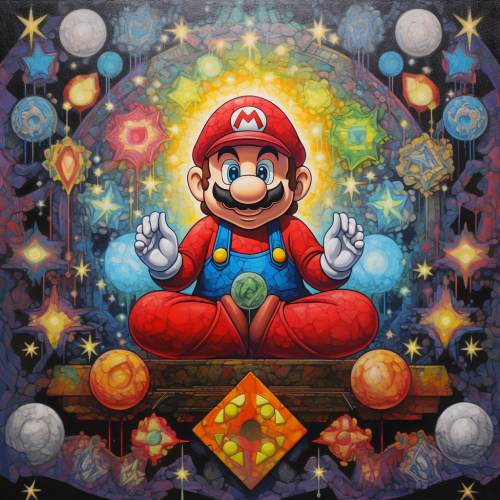 Mario Meditating + obtuse anthropomorphic personification of chaos + extreme existentialism + perfectly executed pointillist precision + pentagram aesthetics + Buddha an optical illusion --v 5.2