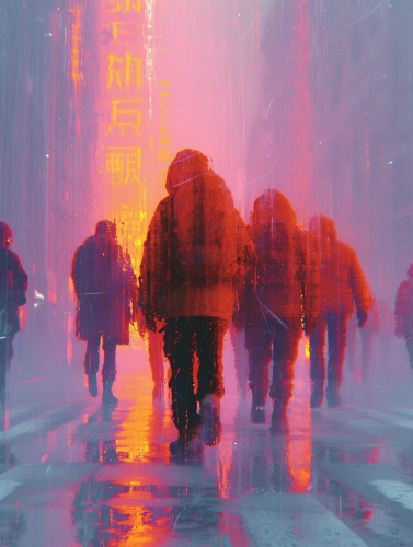 group of cybergoth street urchins in tent village raging, police barricade, hybrids standing on a street crossing, in the style of video art, alejandro jodorowsky, i can't believe how beautiful this is, classic fractal minimalist simplicity, stripes and shapes, depictions of inclement weather,metric symbols tech engraved, symmetry, wierd, insane emotions, dali, 24k, dof, hd, reflection white and azure --ar 9:12 --v 6.0 --s 750 --style raw