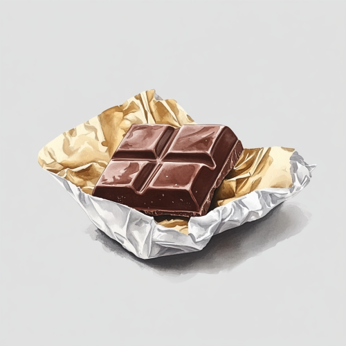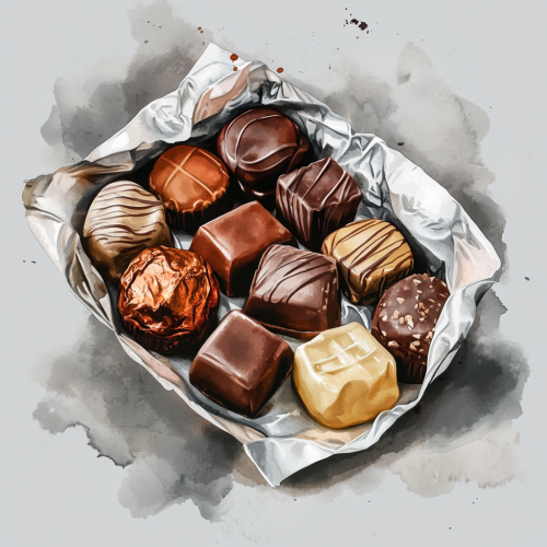 highly detailed watercolor clipart of a table of chocolates, half unwrapped in a beautiful wrapper, soft colors, beautiful illustration with realistic details, high resolution, gray background