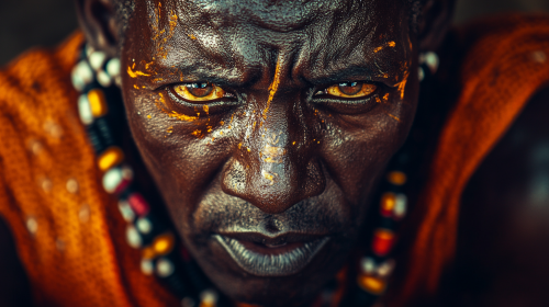 A close-up shot of an African man with deep wrinkles, his eyes wide open in fear and determination as he sits at the center stage. He is wearing traditional attire that reflects his cultural heritage. The lighting casts dramatic shadows on him from above, emphasizing his facial expressions. This portrait captures intense emotions, showcasing intricate details like sweat beads on his skin texture, and vibrant colors of his against a dark background. uhd. --ar 16:9