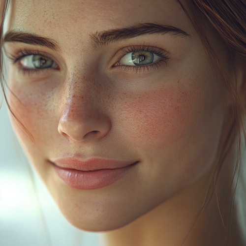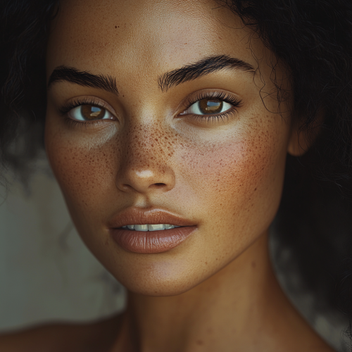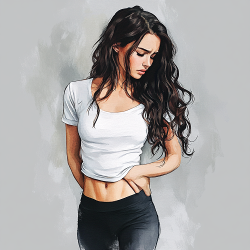 high detailed watercolor clipart of a beautiful girl, dark thick long hair, curls falling to the side, skin with visible pores, one red pimple on the cheek, soft colors, beautiful illustration with realistic details, high resolution, gray background