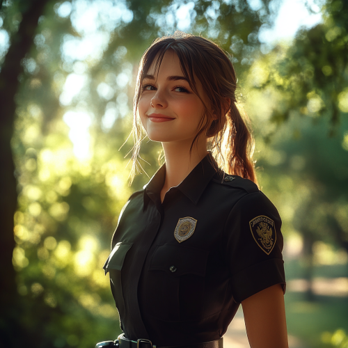 Realistic high-resolution portrait of a beautiful young woman in a police uniform on a warm summer day, smiling warmly at the camera. She’s wearing a skirt as part of her uniform, with soft natural sunlight illuminating her face. The scene captures vibrant colors and a relaxed summer atmosphere, with intricate details in her police uniform and gentle shadows. Shot with a 24 mm lens, cinematic style, hyper-realistic, highly detailed, daytime scene, atmospheric lighting, rich in detail, photography, high quality –ar 16:9 –v 6.1.