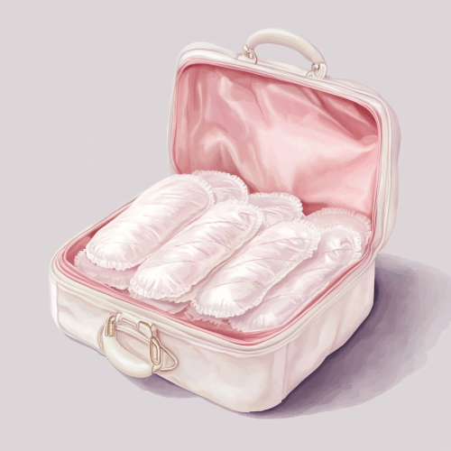 detailed photorealistic watercolor beautiful white elegant open disposable travel bag, full of wrapped sanitary pads, wrapped in soft light pastel pink packaging, luxurious aesthetic, soft colors, beautiful illustration with realistic details, high resolution, gray background