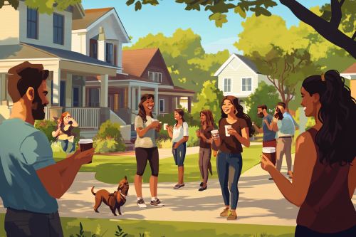 A scene depicting a diverse group of happy residents in a modern, welcoming neighborhood, standing or sitting outside well-maintained homes. They are engaged in friendly conversations, smiling, and enjoying the community atmosphere. Some people are holding coffee cups, while others are playing with their pets The background features clean, tree-lined streets, lush green lawns, and a few residents waving from their porches. The lighting is warm and inviting, giving a sense of comfort and togetherness. close up use real people and realistic scenes --ar 3:2