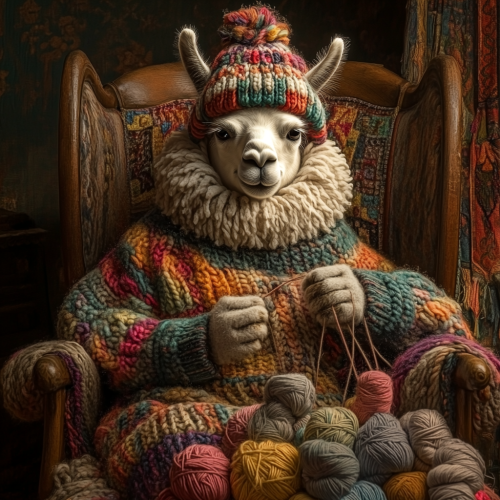 portrait of a lama wearing a knitted hat and sweater, sitting in a large chair knitting a sweater, skeins of yarn piled up on the floor, highly detailed, photo realistic, Vermeer lighting --style raw --s 250