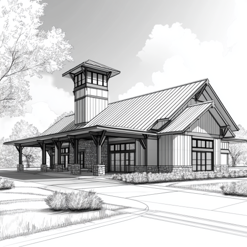 a black and white line drawing render of a firestation designed in the style of a modern farmhouse. The roof is a low slope standing seam metal and the siding is stone and board and batten. There should be wraparound porches and large overhangs. --ar 2:1