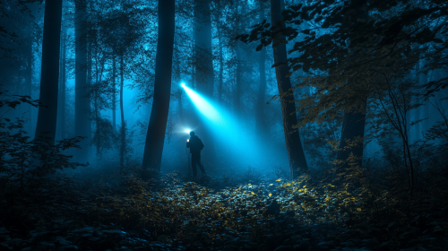 Realistic night scene of a person using a flashlight to illuminate a dense forest, soft light beams penetrating through leaves, shadows and highlights from trees, misty atmosphere, cool color tones, photorealistic details, focused beam of light, natural forest textures, cinematic lighting, high resolution, ultra-detailed, 8K quality --ar 16:9 --style raw