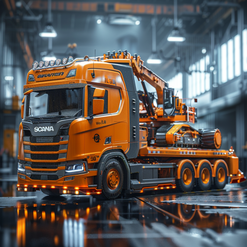 ein werbebild für einen Baumaschinentransport den ich in eine Präsentation einfügen kann. Der stil soll ultra realistisch sein und den LKW Baumaschine zeigen --v 6.0 --style raw --s 250