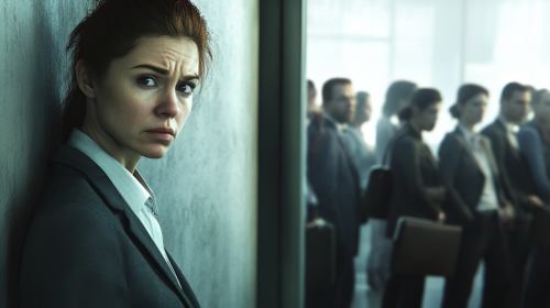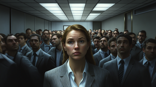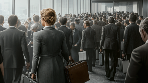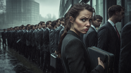 an angry executive woman standing in line in a long interminable line of exhausted office workers all carrying their briefcase all standing in a cue , outside a small office meeting room , grey day , 24 mm, realism image, cinematic style , hyper-realistic, highly detailed, daytime scene, atmospheric lighting, rich in detail, photography, high quality, --ar 16:9 --v 6.1