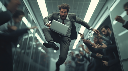 an office worker is smashing his laptop by jumping on it while standing in an interminable cue of exhausted co workers in a modern coridor, grey day , 24 mm, realism image, cinematic style , hyper-realistic, highly detailed, daytime scene, atmospheric lighting, rich in detail, photography, high quality, --ar 16:9 --v 6.1