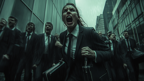 an executive woman is screaming at a long interminable line of exhausted office workers carrying their briefcase standing in a cue , outside an office building , rainy day , 24 mm, realism image, cinematic style , hyper-realistic, highly detailed, daytime scene, atmospheric lighting, rich in detail, photography, high quality, --ar 16:9 --v 6.1