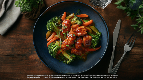 "Realistic high-quality close-up of a beautifully plated dish of [nome della ricetta], captured in natural lighting. The dish is presented on a rustic wooden table with subtle, fresh ingredients scattered around as garnish. The food is warm, fresh, and inviting, with visible textures and vibrant colors. The setting includes small touches, like a folded napkin, silver cutlery, and a glass of water in the background, giving the scene a cozy, appetizing feel." Stir-fry de poulet : 150 g de poulet, 200 g de légumes variés (brocoli, poivrons, carottes) et 1 cuillère à soupe de sauce soja faible en sodium. --ar 16:9