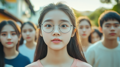 a group of young asians curious looking to camera, house yard background, unreal gesture, expressive curious facial expression, various front angle, ultra realistic, --ar 16:9