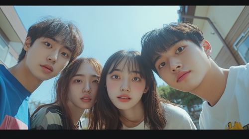 four young asians curious looking to camera, house yard background, they are 24 years old, they wears casual outfits, unreal gesture, wacky curious facial expression, various front angle, super long shot, ultra realistic, --ar 16:9