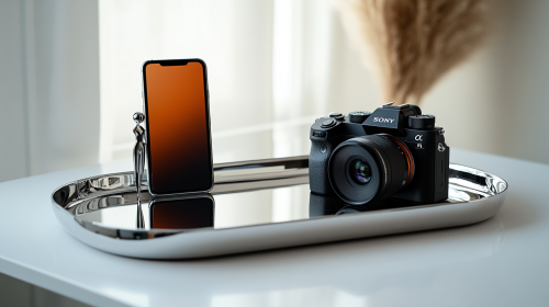 : a editorial photo shoot of a modern and minimalistic living room, featuring a curved sofa with a coffee table, rug underneath it, accent arch wall, small potted plant, studio lighting, beige background, painting on the wall, ultra-realistic photography
