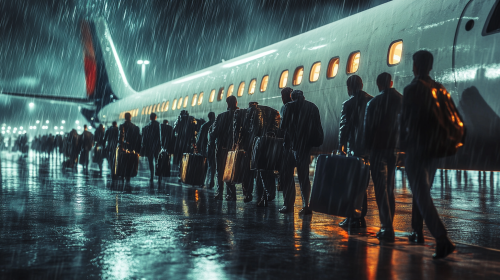 a long interminable line of exhausted office workers carrying their briefcase standing in a cue , outside an commercial airline plane, rainy day , 24 mm, realism image, cinematic style , hyper-realistic, highly detailed, daytime scene, atmospheric lighting, rich in detail, photography, high quality, --ar 16:9 --v 6.1