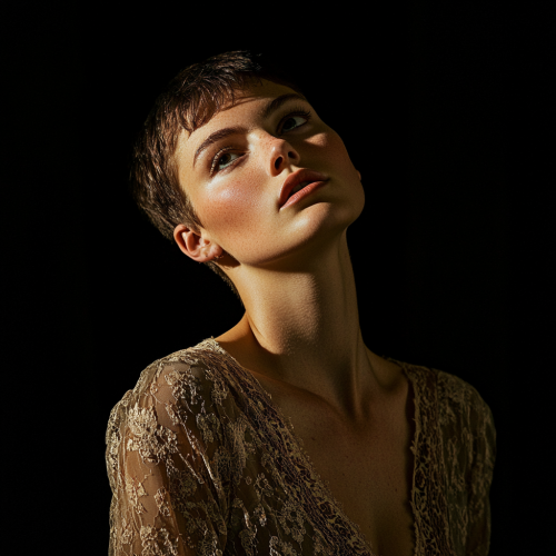 a breathtakingly gorgeous woman with raven hair and pale green eyes. She is facing forward towards the camera. Warm lighting. Realistic highly detailed photograph. Wearing a choker. Hair is flat and shoulder length tied back out of her face.