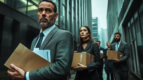 an upset executive business man and his secretary are standing in an interminable line of exhausted office workers who are carrying boxes and documents, all standing in a cue , outside an office building , rainy day , 24 mm, realism image, cinematic style , hyper-realistic, highly detailed, daytime scene, atmospheric lighting, rich in detail, photography, high quality, --ar 16:9 --v 6.1