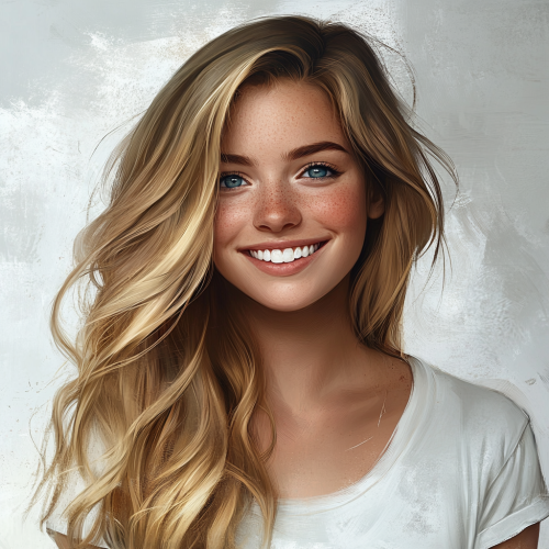 A young woman, 25 years old, with long, wavy blonde hair, bright blue eyes, and a fit athletic build. She has a cheerful smile and a confident, charismatic presence, photorealistic, character sheet