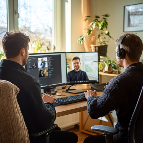 Create an very realistiv image of two people in a virtual meeting, sitting at their desks with computers, engaging in a supportive conversation. The focus should be on their screens displaying a video call interface, with friendly expressions and collaborative gestures, emphasizing teamwork and communication. The background should be a professional home office setting, conveying a sense of productivity. --v 6.1