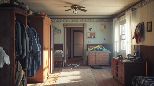 A series of realistic shots showcasing the rooms and areas explored by the protagonist during the search inside the house. These images should capture the mundane details of each room - bedrooms, bathroom, closets, living room, kitchen, dining room, and the small basement. Emphasize the ordinary nature of the surroundings, building a sense of suspense as the protagonist investigates. --ar 16:9 --v 6.0