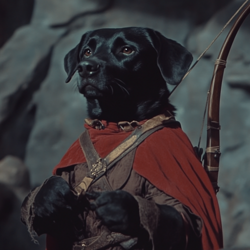 Low resolution screengrab of 1950's Super panavision 70 movie. Retro in colour. A humanoid figure with the head of a Black Labrador dog dressed as a medieval archer. The setting is a dark fantasy world --ar 1:1