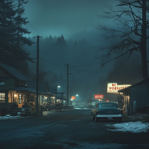 A photorealistic image of a lowlit 1950s urban neighborhood in an Oregon logging town. Night time. Reminiscent of a film still inspired by Wes Anderson and Conor Harrington. The scene is set against a dark, shadowy background, adding depth and intensity to the composition. The image is captured with a 200mm lens, HD quality, at f/2.0, ensuring a highly detailed and accurate representation with a vintage, cinematic feel. --ar 1:1 --stylize 250 --v 6.1