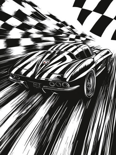 Detailed black-and-white woodcut, C2 Corvette racing scene, sharp lines and split rear window, bold tire marks on track, intense motion lines, gritty woodcut texture, checkered flag and racing banners, high contrast, classic dynamic style. --v 6.1 --s 50 --ar 3:4