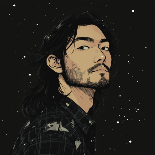 sketched portrait of a retro sci-fi android with a Warforged face, dented and old, calm expression, broad and strong looking, K-2SO, metallic, wearing a 90s short boiler suit inspired by the clothing from the Alien movie franchise, aged in his 20s, on a black background in the style of John Berkey illustrations, small dots of dull sci-fi light and stars in the background, dark space, black and white, --v 6.1