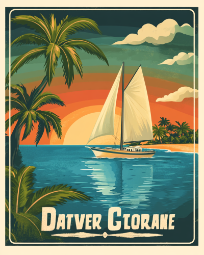 A vintage-style travel poster of a tropical island, featuring a sailboat cruising past a sunset-lit beach. Palm trees sway in the breeze, and the ocean is a gradient of blue and turquoise. The poster has a retro, hand-painted look with bold typography for the destination name, and soft, muted colors. --ar 4:5