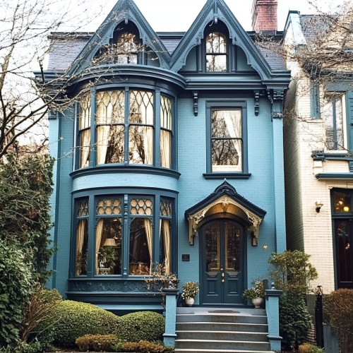 a quintessential English bay window. The architectural style is victorian. The decor is tasteful, muted and playful. The colours are rich and chalky pastels.