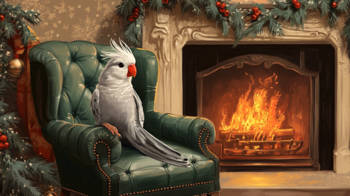a very cute blue cockatiel sitting cutely in a large red leather chair that' s by a roaring fireplace with christmas garland hanging over the mantel. white background, light colours, style drawn in pencil very classic look. like a christmas card from hallmark around 1985. --ar 16:9