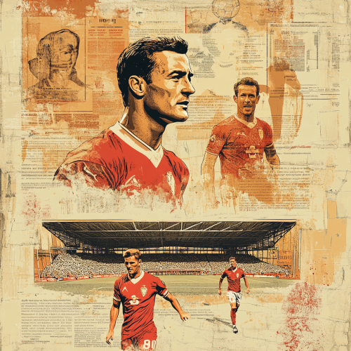 A vintage magazine spread for a 2000s football magazine focused on Arsenal Football Club, featuring a retro design with worn edges and faded colors. The spread should include classic Arsenal players in vintage kits, a detailed illustration of Highbury Stadium, and nostalgic elements like retro typography, football stats, and player profiles. Background includes advertisements typical of the era. The color palette should be warm and slightly faded to give an authentic retro feel.