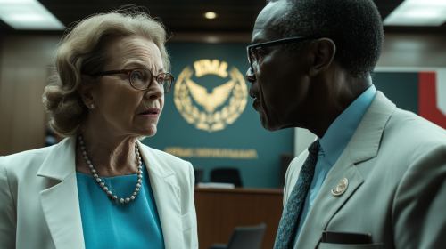 Vintage photo of an evil-looking demon wearing a suit and tie with horns, standing behind a desk in the White House office shaking hands with elon musk, donalds trumps is standing beside both of them, with a 1960s aesthetic, vintage film grain, and a vintage feel, shot with leica m3 --ar 3:4 --s 750 --q 2