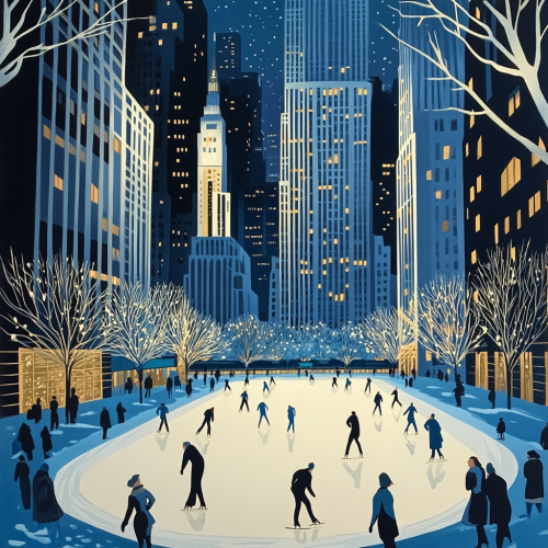 an art deco poster of The ice skating rink at Rockefeller Center in New york city. Use traditional art deco colors including blue, black, white, grey and gold.