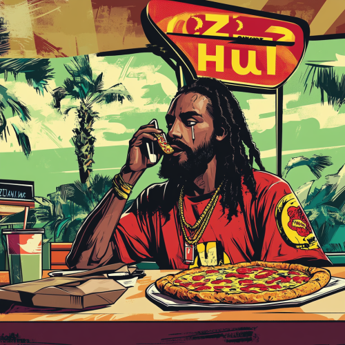 Pop art vintage comic book style of a character resembling Black Jesus sitting in a Pizza Hut, speaking on the phone and enjoying a slice of pizza. The scene includes a bright, stylized Pizza Hut sign in the background. The artwork features bold lines, vibrant colors, and the classic halftone dot pattern often used in pop art, creating a retro yet lively atmosphere. The character exudes a relaxed, friendly demeanor, with a table full of pizza boxes and drink cups to complete the casual setting