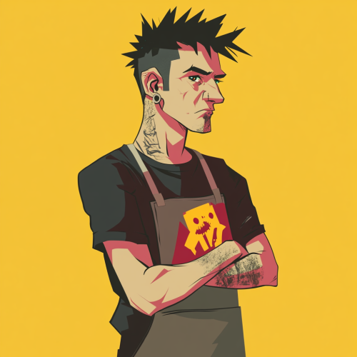 Create an illustration in a punk minimalist style, with an energetic punk and grunge vibe. Use primarily burgundy, dark cold brown, and gray, with pops of bright yellow. In the center, depict a punk-styled character who is the manager of a restaurant, viewed in a three-quarter perspective. He has messy, black-dyed hair and piercings in his ears. His arms are crossed, and although his face is not very expressive, he has a friendly demeanor. He wears a faded black T-shirt with a worn logo and a tattered kitchen apron. The background is bland --v 6.1 --s 50