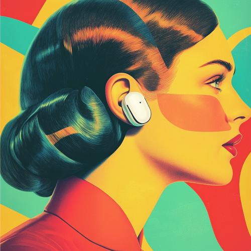 A 1950s-style advertisement inspired by Banania ads, with a close-up zoom on a woman’s ear wearing authentic Apple AirPods. The style is bold and colorful, using vibrant pastel tones with thick, clean lines typical of mid-century advertising. --q 2